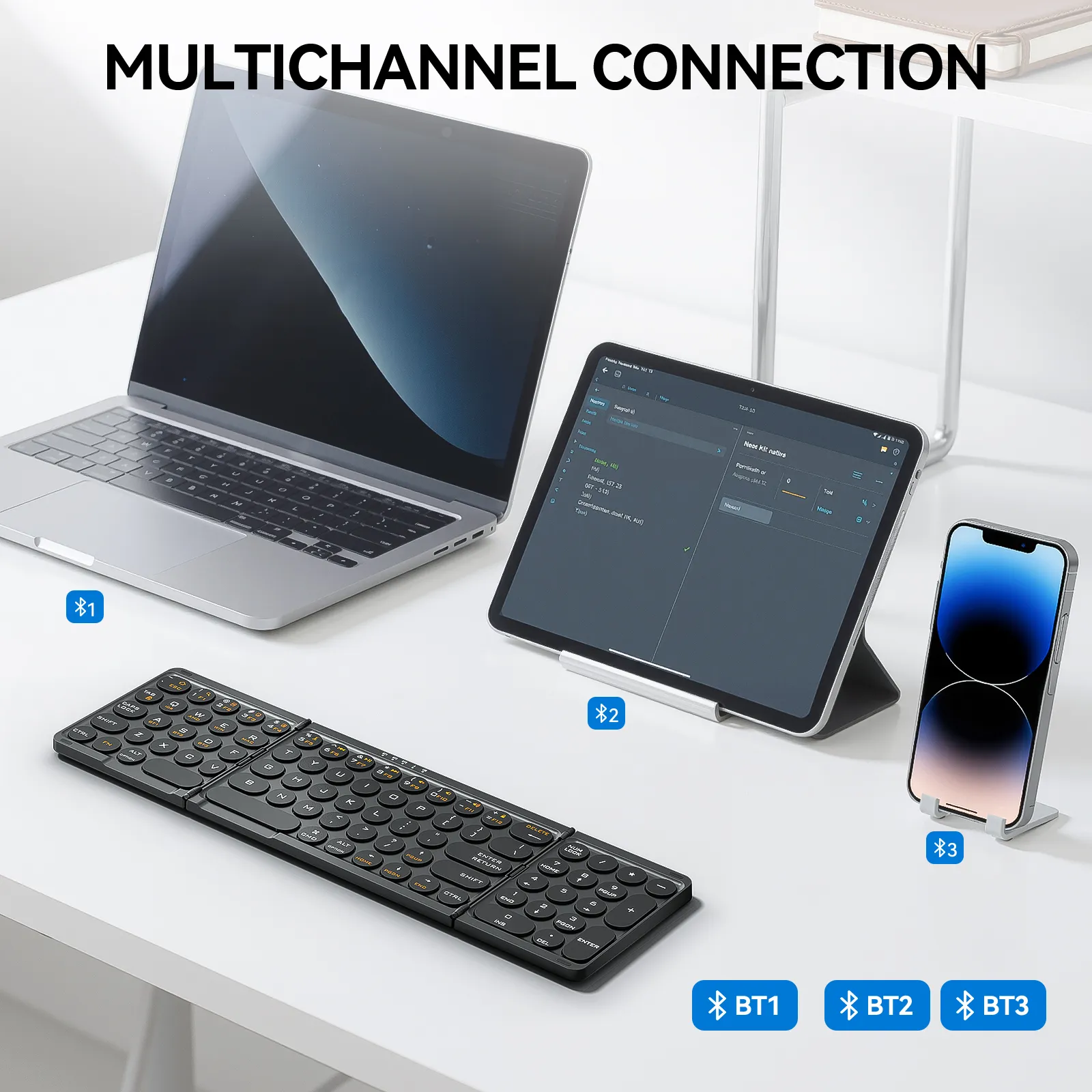 Universal for multiple systems, portable mini type suitable for mobile phones, tablets, and business office use, featuring a numeric keypad, a three-fold Bluetooth wireless keyboard with good key feel, a phone and tablet stand, and a portable leather case.